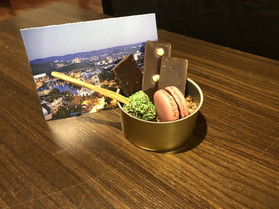 Välkomstkort, 2 flaskor av deras eget Radisson flaskvatten och en lite skum burk med musli i botten, några bitar litauiska choklad, en macaron och en till typ godisbit.