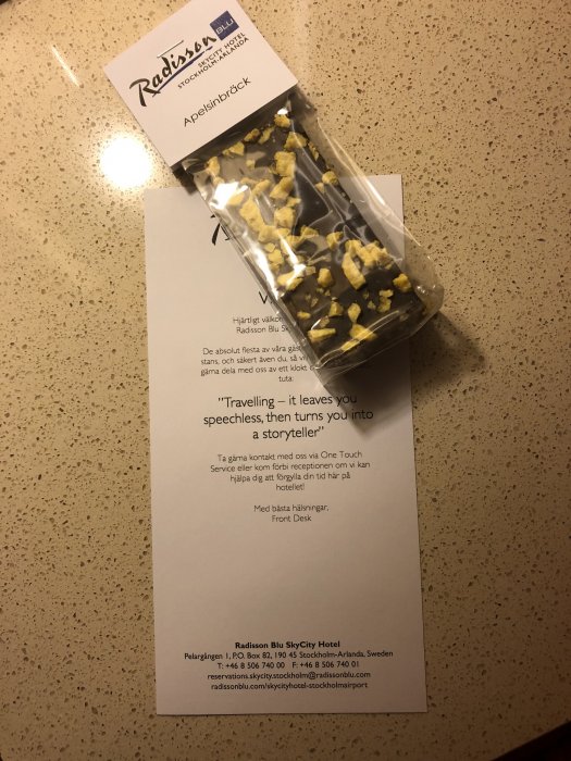 Fick ett välkomstmeddelande samt en 40 grams apelsinbräck (har fått samma på Radisson Arlandia).