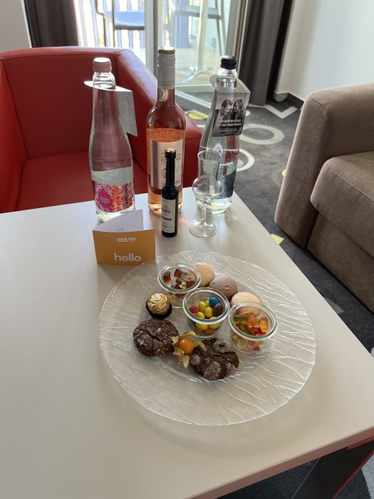 Snudd på nytt rekord i välkomstgåvor. Två flaskor vatten (i glasflaskor), en flaska rosé, en flaska lokal snapps och ett generöst fat med godis och kakor.