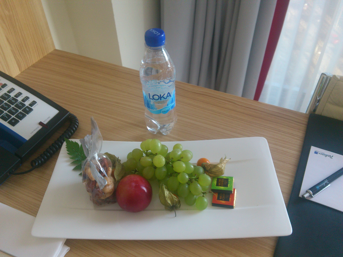 Från vanligt rum till business class i Vilnius på Hotel Astoria. Stort fruktfat, mineralvatten och välkomstbrev som CCC.