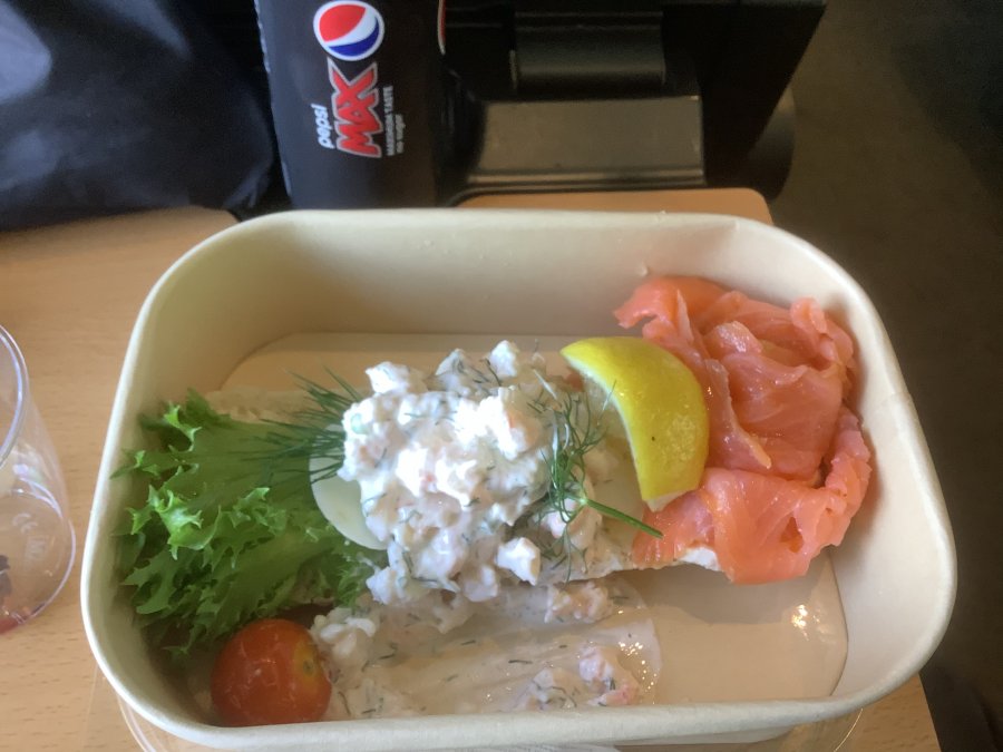 Glömt att förbeställa räkmackan, vet att den finns att köpa i bistron, men trevligare att få den serverad vid stolen.