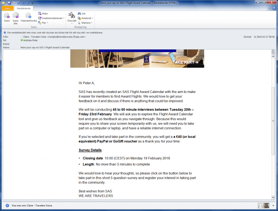 Fått mail från SAS om att delta i en undersökning om deras award calendar. Gick in här i forumet för att se om någon annan fått samma mail, men hittade ingen tråd i ärendet. Eftersom de erbjuder ersättning, kan det vara hoax?