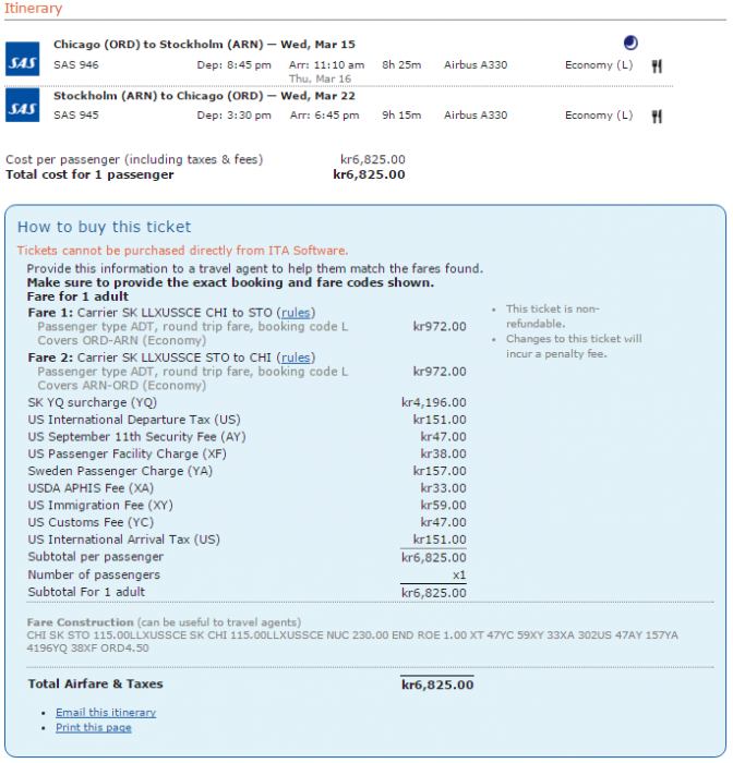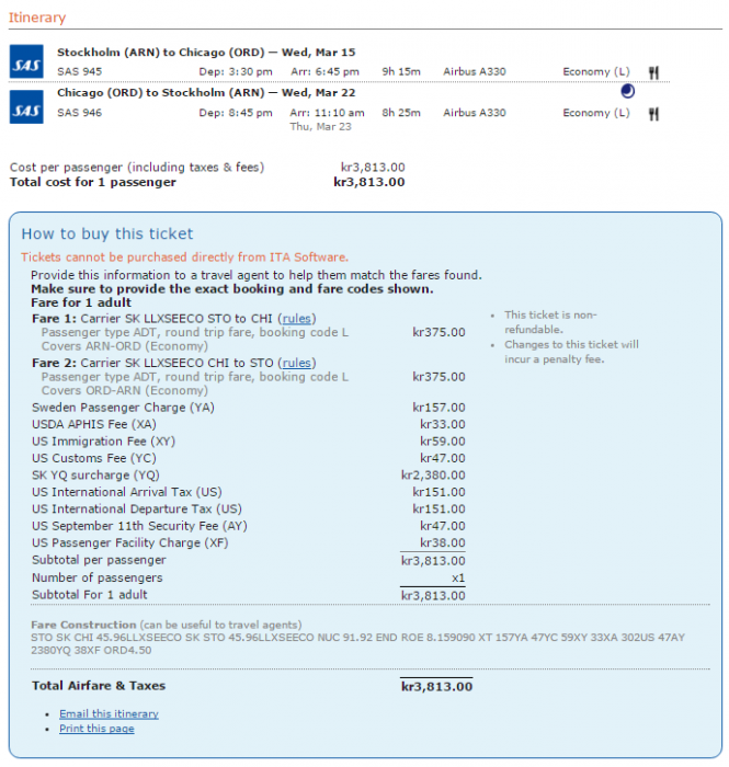 Samma biljett med start i Sverige jämfört med start i USA. YQ är nästan det dubbla och fare basis är nästan 3 ggr så hög. Hade Stockholm som sales city på båda dessa sökningar