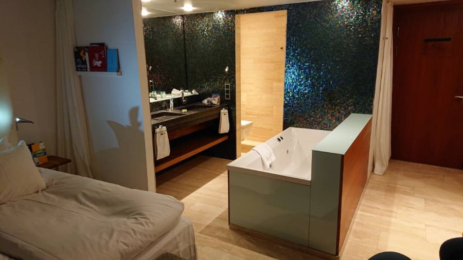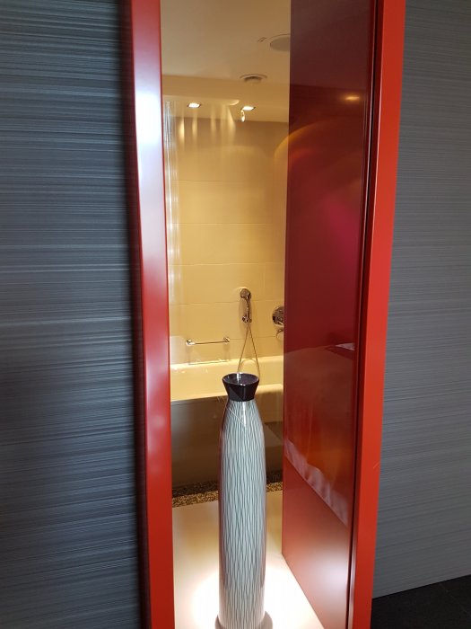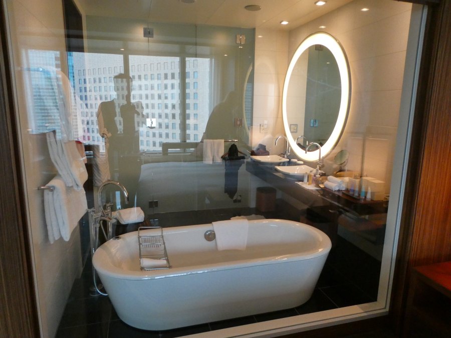 Conrad Tokyo, trevligt när man ligger i badet att kunna kika ut på staden. Det går att köra ned en gardin för fönstret när man vill vara mer privat.