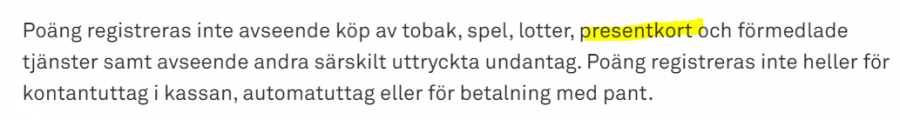 Detta har jag inte testat. Hur fungerar poängräkningen vid presentkort? Dvs får man poängen när presentkortet köps in, eller när man använder det? (Eller, vilket jag iofs har svårt att tro, i bägge fallen...?)