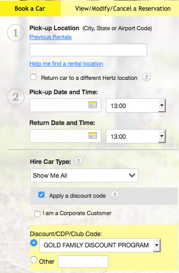 (Registreringslänken dirigerar dig till olika sidor beroende på vilket land som är inställt. Börja med att gå in på hertz.com och ändra land till USA/Förenta staterna högst upp i högra hörnet, gå därefter till www.hertz.com/goldfamily)