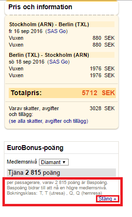 Hej, Jag följer med glädje alla intressanta "trådar" och lär mig mycket. Tänkte nu fråga alla kunniga medlemmar för att få hjälp med hur kan man veta i vilken bokningsklass man får på sin biljett? Det finns ju en massa olika varianter. Jag kämpar för att behålla mitt SAS Guldkort varje år och går då och då på nitar när jag bokar med andra Star Alliance flygbolag då jag ibland får bokningsklass på min biljett som inte ger några eller mycket få Eurobonus poäng. Hur kan jag få koll på bokningsklassen när jag bokar en biljett på nätet? Jag flyger (tyvärr) alltid i ekonomi. Alla tips på hur jag kan optimera detta mottages tacksamt!