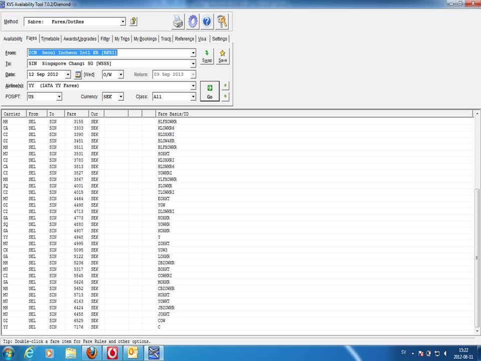 Du verkar ha fått fram en del mera info än jag får på mina sökningar, bl a ett totalpris. Jag körde en sökning på ICN-SIN i september och IATA-priser ska vara det som är markerade med YY och sedan kan du se om det är Y, C, eller F. Vad som jag är lite brydd över i min sökning att jag inte fick något pris i F.