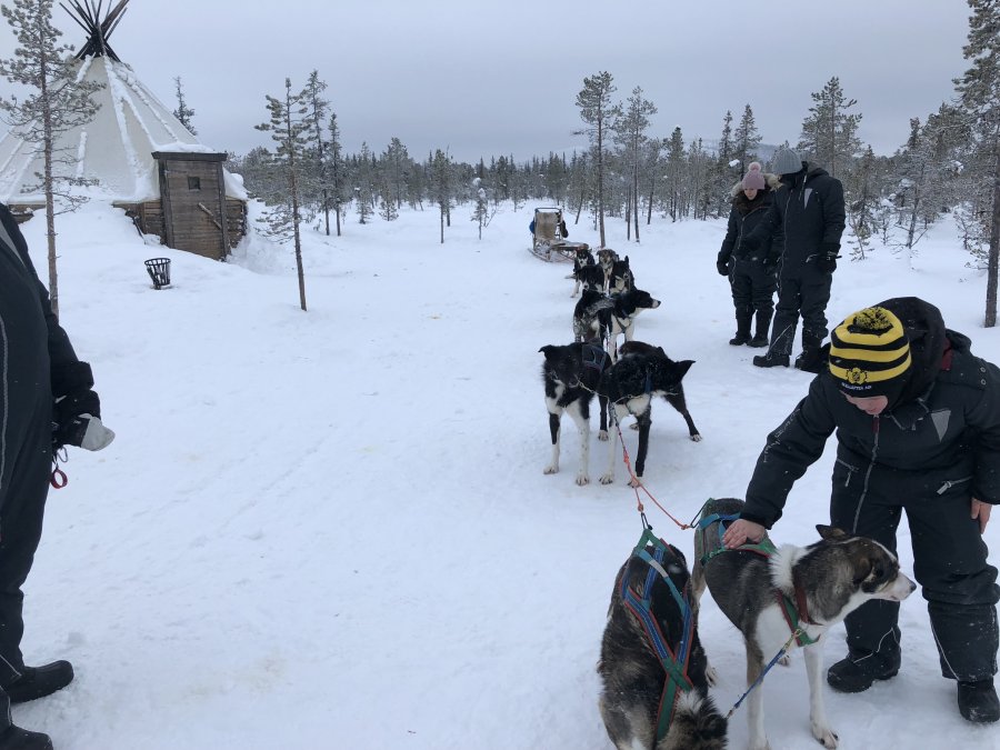 Efter lunchen så hade vi bokat en tur med slädhundar, mötet med husky-hundarna var speciellt uppskattat av 8-åringen, som fick många fantastiska stunder med hundarna. Turen i sig var inte så spektakulär, eftersom att vi bor i Norrland i en liknande natur, tror det amerikanska paret som bodde på Manhattan som åkte på samma släde tyckte det var mer spektakulärt än vad vi tyckte. Varma kläder och skor fick man låna på Ice Hotel, det ingick i priset.