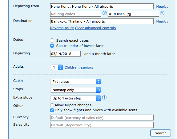 Jag kollade ExpertFlyer den 14:e och 15:e april. TG600 och TG606 listas som B747-400 men det säljs inte First. Jag kollade seating och platser är blockade i Firstkabinen.