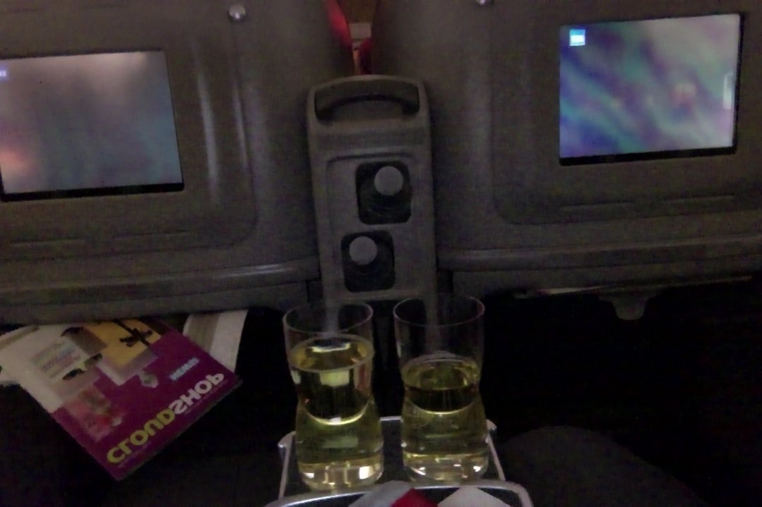 Pursern beslutade att servera förfriskningar under tiden vi väntar och som tur var är champangen öppnad, så jag och FruAgehall har nu var sitt glas framför oss.