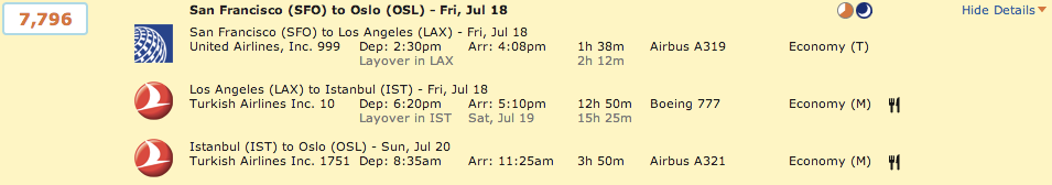 Sitter och leker lite med ITA men lyckas inte hitta någon lösning hur man kan tvinga fram en viss bokningsklass för första flyget bara. Jag letar efter SFO-OSL via IST (önskar stopp) och skriver in i advanced routing: