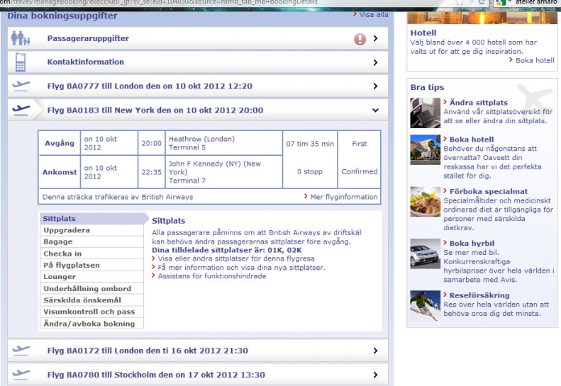 SAS Bokningshantering (hade det inte varit resebyrå skulle det gå att välja säte, ändra eller avboka):