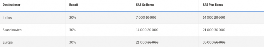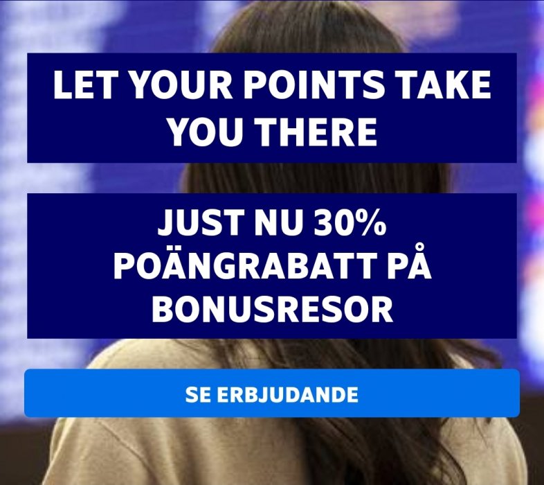 Erbjudandet gäller resor tur/retur med SAS och/eller Widerøe i SAS Go Bonus och SAS Plus Bonus som bokas senast 8/2 2021. Reseperiod inrikes, Skandinavien och Europa: 1/4 2021 – 30/9 2021. Antalet platser är begränsat. Skatter och avgifter tillkommer. Barn 2–11 år får alltid 50% rabatt på poängpriset. Logga in på ditt EuroBonus-konto för att se poängrabatterna.