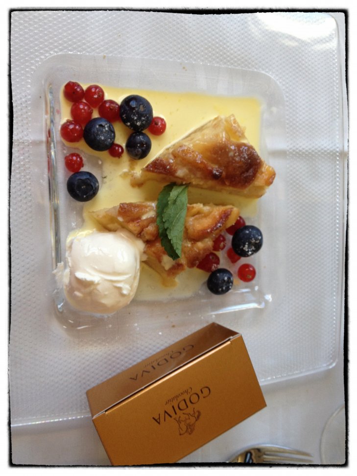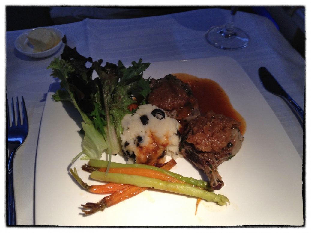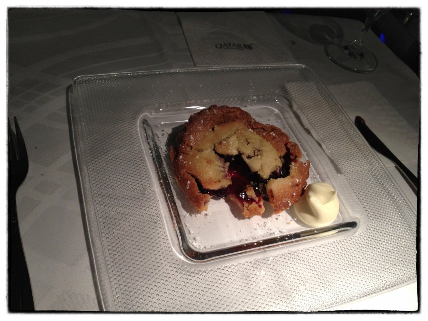Boarding gick snabbt då business började på gängse manér. Väl på plats blev jag informerad om att det var bara 9 pax i C så välj valfritt säte. Lanson brut Vintage Gold Label 1998 serverades innan rumpan hade landat på sätet. 2-0 till Qatar jämfört med Swiss (både hastigheten och kvaliteten). Bärnstensgult bubblande i glasen, brödigt, gott, några månader till och den hade varit passé, nu bara ljuvlig. Meze knyten med en creme fraiche artad sås som var lite för söt för champagnen om man skall vara kinkig. En utomordentlig skaldjursallad, följt av en arabiskt kryddad kycklingfilé och jag valde ett mjukt Spanskt Torres Salmos 2008 rödvin. Ett av Torres prestige viner. Matmässigt oavgjort mot Swiss (1-1). Vin mässigt vinst för Qatar (1-0). Ni vet jag gnällde över att rödvin ombord på flyg ofta är kallt. Till och med Swiss i C serverade kylskåpskallt rödvin och jag undrade var man kan hitta rumstempererat rödvin. Nu vet jag, Qatar Airways. Okej, jag vet vi är inne på finliret, men varför inte. Till efterrätt valde jag en ljummen äpplepaj med vanilj creme, vinbär och björnbär serverat på en elegant glastallrik.
