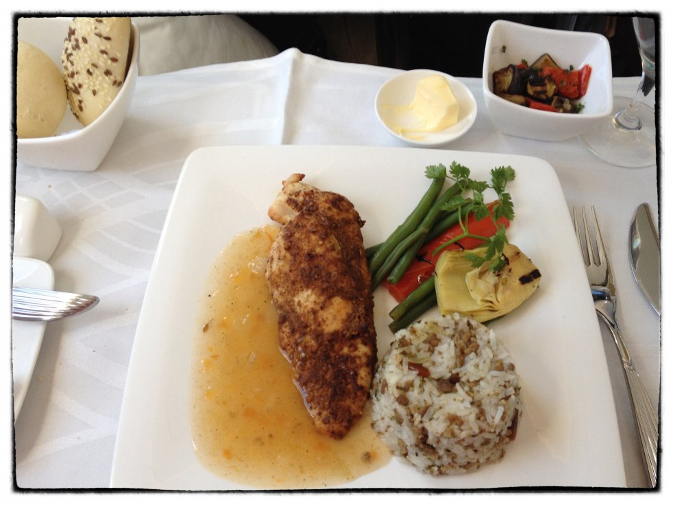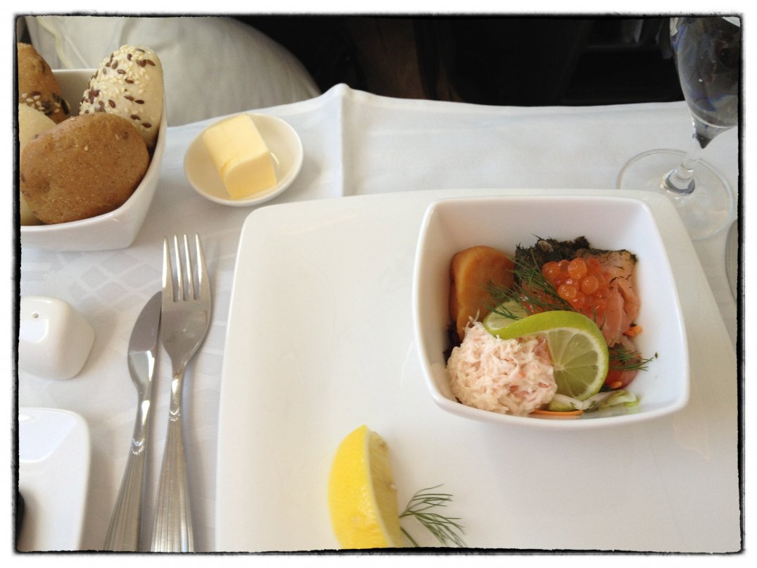 Några minuter efter att jag hissat upp mig till halvliggande blir jag erbjuden dryck och frukost menyn. Blir informerad om att det tar 10 – 15 minuter innan min frukost är klar. Passar bra, hinner byta om. Färskpressad juice, dock inte den mjuka Florida varianten utan lite syrligare. Cappuccino eller Café au lait? Det får bli den franska varianten. En brödkorg på brickan, müsli med mjölk, varm mat i form av omelett, kebab liknande färsrulle som var välkryddad, färsk frukt. Croissanten var lite kompakt men det var väl egentligen det enda i-landsproblemet. Nu när jag hittat ett flygbolag med rumstempererat rödvin kanske man skulle fokusera på att hitta den bästa flygande croissanten?