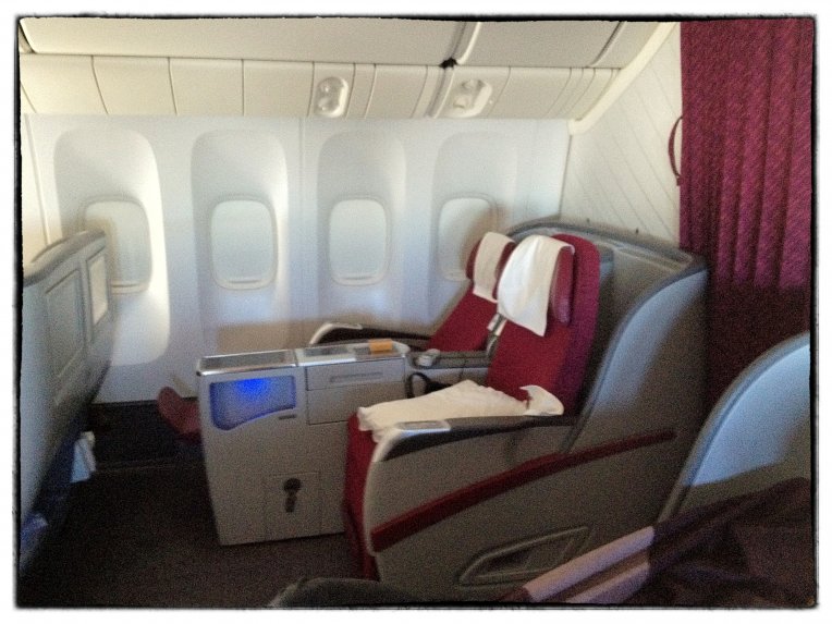 Som vanligt bestämde man själv hur man vill ha det (fast jag hade precis fattat det). Sova direkt, endast äta meze liknande appetizers och ta en fyra rätters menu när man vaknade, vilket passade passageraren på Australien tid bäst, eller som jag gjorde då klockan var strax efter midnatt europeisk tid, satsa på en middag för att sedan byta om till pyjamas. Rätterna serverades i ett lagom tempo med 10-15 minuter mellan varje. Började med mer skumpa och blandade nötter. Valde sedan att gå på fisklinjen med en utmärkt sallad på grillade pilgrimsmusslor och lax, följt av en kycklingrulle med asiatiska kryddor, bland annat färsk koriander. Varmrätten bestod av en torskliknande fisk med en tomat kapris sås. Blev alldeles för mätt för ostbricka (synd de serverade en single Vintage Tawny Port från 1974) och dessert. Man skall orka sova också. 2-0 till Qatar för maten och det trevligt långsamma tempot. Inget stressfullt tuggande för att hinna med. Här är det inga dryckesvagnar som skramlar runt, utan flaskor och påfyllning levereras inviduellt vid minsta antydan till ebb i glaset. Pyjamasen var nästan lite varm. Men man fick ju hjälp med bäddningen, allt för att man inte skall överanstränga sig. Sov överlag bra. Fast den där nackkudden gjorde det lite knepigt med magläge i alla fall. Men betydligt mer utrymme än Swiss, oavgjort får det bli.