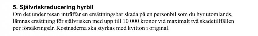 Jag uttryckte mig uppenbarligen otydligt tidigare eftersom både @Homer och @Capa verkade missförstå mig. Det som lätt gör situationen förvirrad är att vi hela tiden pratar om två olika försäkringar. Dels har vi bilfirmans försäkring som ofta har en ganska saftig självrisk och dels har vi (i detta fall) Folksam Resklar. Det jag försökte förklara i mitt tidigare inlägg var att om du inte har självriskeliminering via folksam innebär det att du får betala kostnaden för skadan om den understiger självrisken och i annat fall får du betala självrisken (det är egentlgien bara en beskrivning av hur självrisk fungerar men det förekom en, i mina ögon, något förvirrad diskussion om detta tidigare i tråden). Vad gäller då om du har självriskeliminering via folksams Resklar? Jo, då betalar du inte ett öre för en skada som täcks av hyrbilsfirmans försäkring upp till det totala beloppet om 10 000 kr. Om hyrbilsfirman har självrisk på 100 000 kr och skadan kostar 10 000 kr är du med andra ord täckt. Varje krona som överstiger 10 000 kr får du betala för. Saknar däremot hyrbilsfirman försäkring blir det mer intressant.
