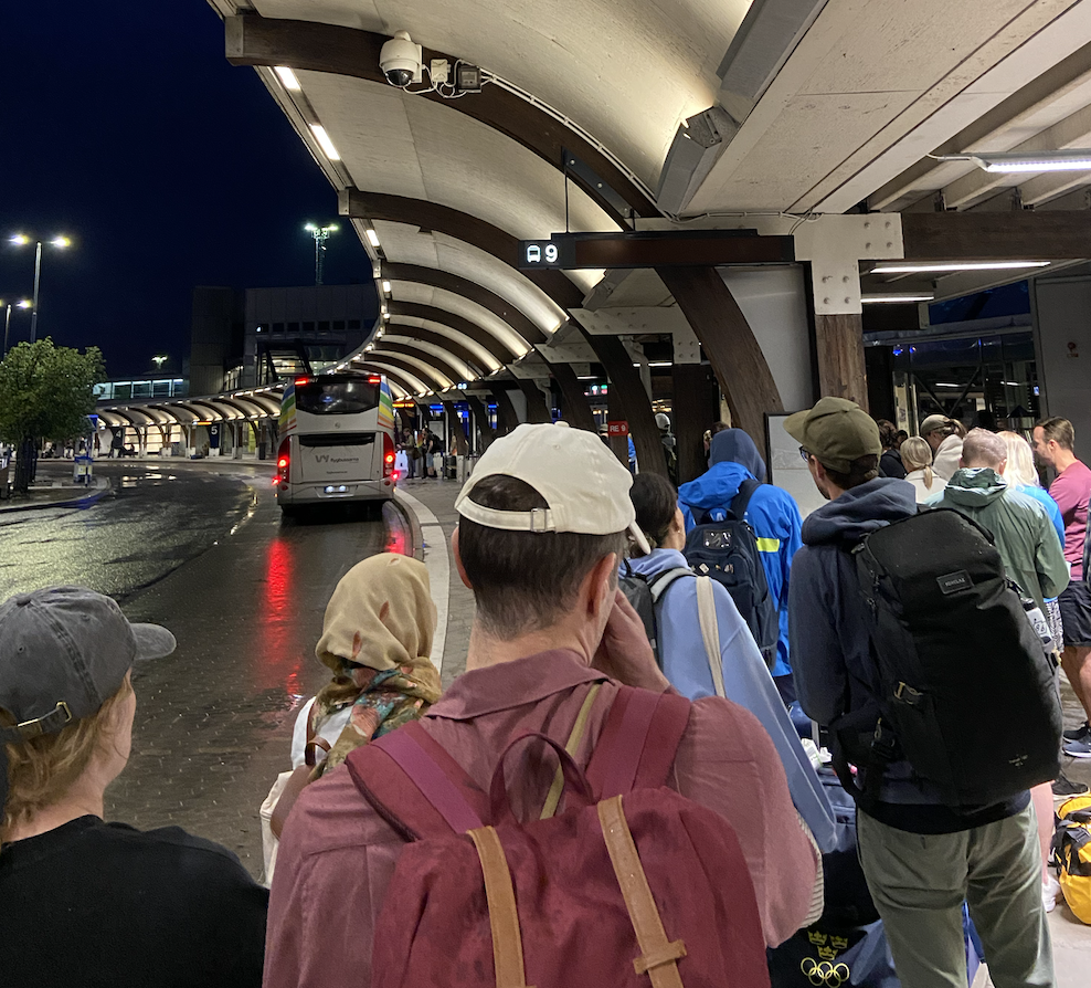 Landade på Arlanda i morse kl 1 (försenat SAS plan, och inte det enda planet som kom in med rejäl försening). Gigantisk taxikö, gigantisk kö till Flygbussarna mot Stockholm. Det var flygbussen jag var ute efter. Tog ungefär en timmes väntetid. Lyckades komma med med bussen som avgick kl 2:10. Enligt tidtabell skulle nästa buss först avgå kl 4, så två timmar senare. Men hörde hur min bussförarare kommunicerade med sin ledningscentral att de skulle "hoppa över" tidtabellen och helt enkelt fortsätta skicka bussar. Överlag bra jobbat av Flygbussarna – de gjorde vad dem kunde. Men dålig upplevelse annars. Enligt mig borde det gå Arlanda Express tåg minst var 45:e minut hela natten nu under sommarmånaderna, mtp hur mycket alla reser. Sjukt att biljetten där är så dyr, och så kan de inte ens erbjuda sådant.