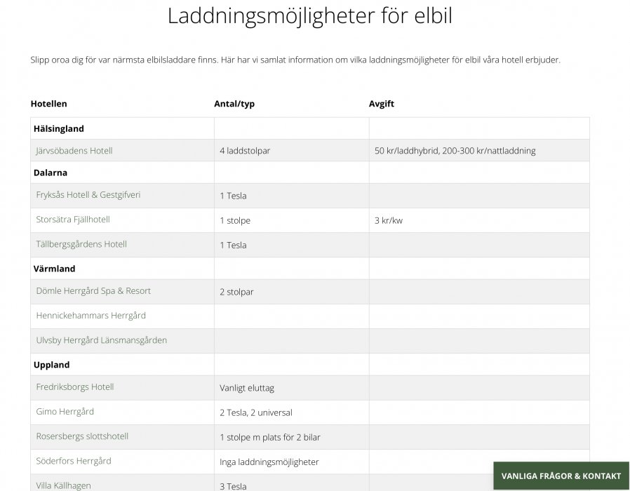 Jag planerar en resa i Sverige och har tidigare utnyttjat Countryside Hotel då deras fristående hotell har passat mina krav. Nu upptäckte jag att Countryside Hotel har samlat alla de hotell, som erbjuder sina gäster laddmöjlighet. Här är några förslag från hemsidan: