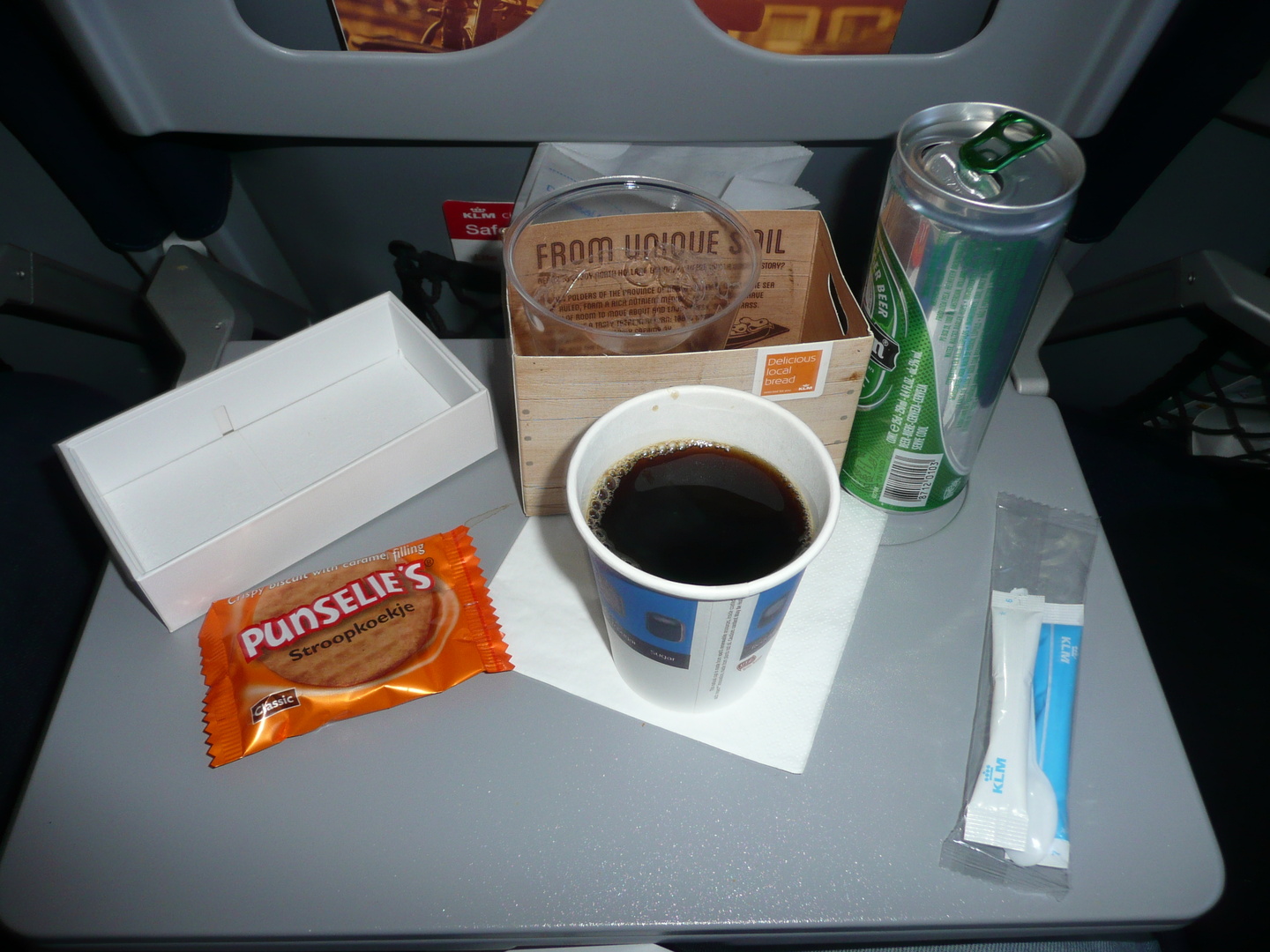 Flygningen gick alldeles utmärkt. Jag vet inte om personalen på LPI hade informerat flygvärdinnorna om vårt lilla äventyr och allt hysch-pysch men jag upplevde det verkligen som att de ville göra oss glada och nöjda. Serveringen ombord var som vanligt på denna typen av flygning med KLM denna;