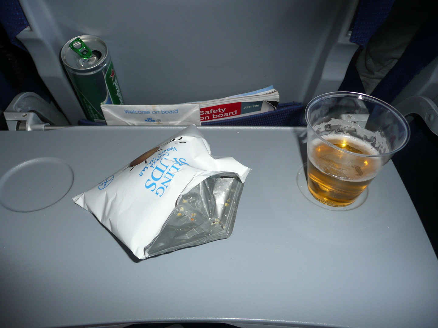 Som ni ser föll valet på kaffe och en kall Heineken till den, faktiskt, goda smörgåsen som denna gång innehöll goudaost och senaps (?) dressing. Valet av alkoholhaltiga var redan nämnda Heineken, rött eller vitt vin. Kakan till kaffet tycker jag är väldigt god. När vi närmade oss Amsterdam gjorde sig törsten påmind och vi bad om en Heineken till, vilket vi fick. Detta gladde mig mycket då jag inte trodde att man fick en öl till i ekonomiklass.