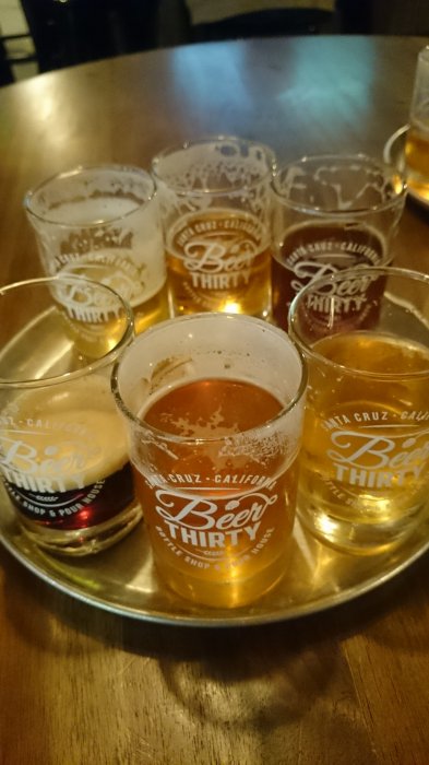 Vi har nu kört ner till Santa Cruz där det blir ett första stopp hos Discretion Brewing för lite mat och en beerflight, jag slipper köra .