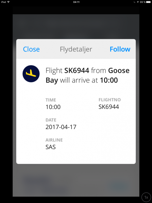 10:00 i CPH är omöjligt eftersom planet inte lyft från Goose Bay än.Enligt uppgifter på CPH appen skall hon landa som SK6944 klockan 10.00 idag.
