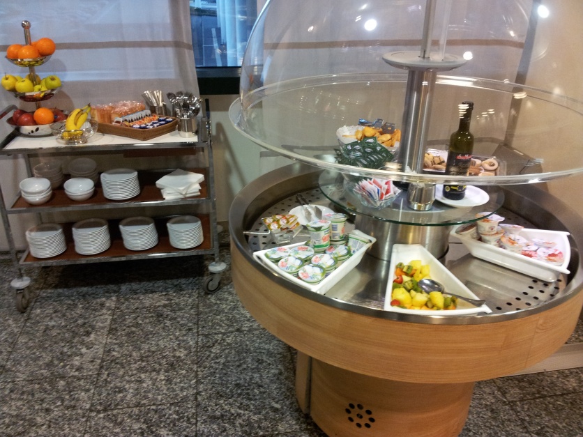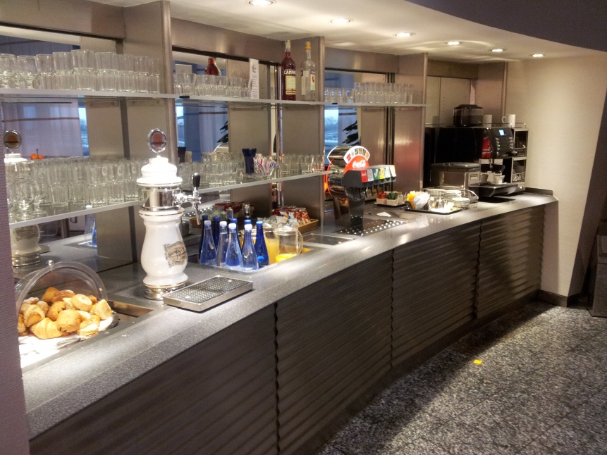 Självserveringsbuffé i ena hörnet med smörgåsar, desserter samt enklare varm mat och kallskuret. Två "barer" med själservering av dryck. Det finns ett basutbud av juicer, läsk, öl, vin och några sorters sprit. En kaffemaskin gör väldigt gott kaffe(för att vara kaffeautomat)