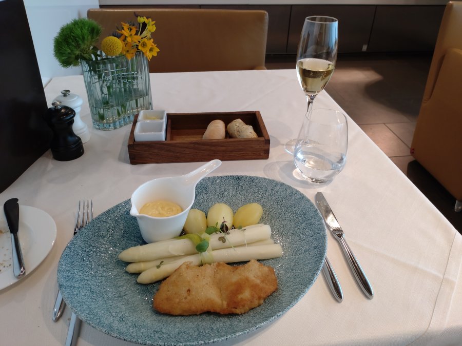 Stötte på den alltid så trevlige @Tommy här av en slump! Vi tjattrar i en kvart innan Tommy måste bege sig mot sitt flyg till Stockholm. Jag fortsätter med kalv-schnitzel och sparris till lunch.