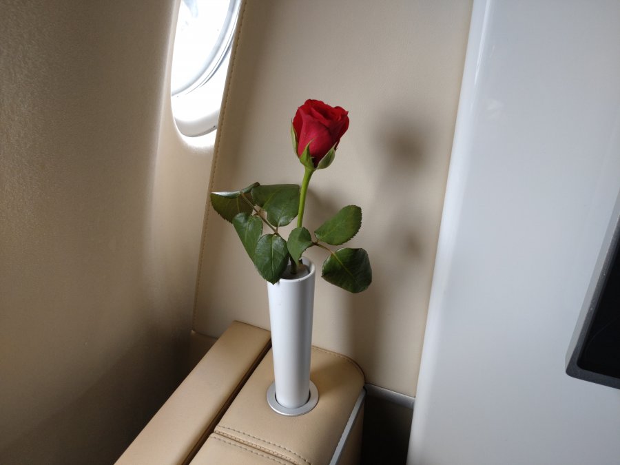 Jag var en av de första ombord på den A340-600 som skulle ta oss till BOS. Lufthansas First-kabin börjar bli till åren kommen och har rätt små skärmar tex. Samtidigt på en dagflygning som denna uppskattar jag den öppna, ljusa kabinen som ger en härlig känsla av rymd. Vi var sex passagerare här. Rosorna ger en nice touch!