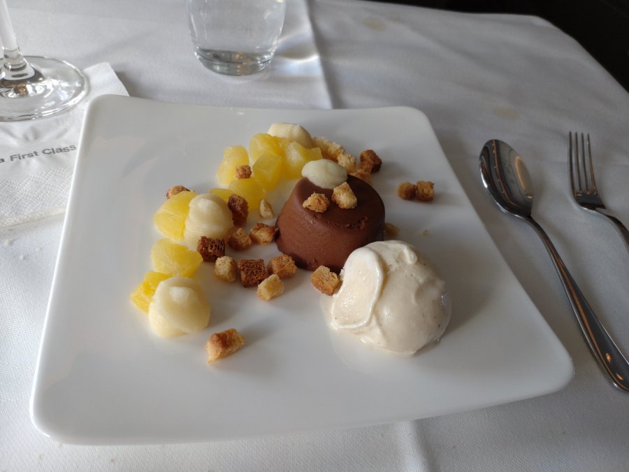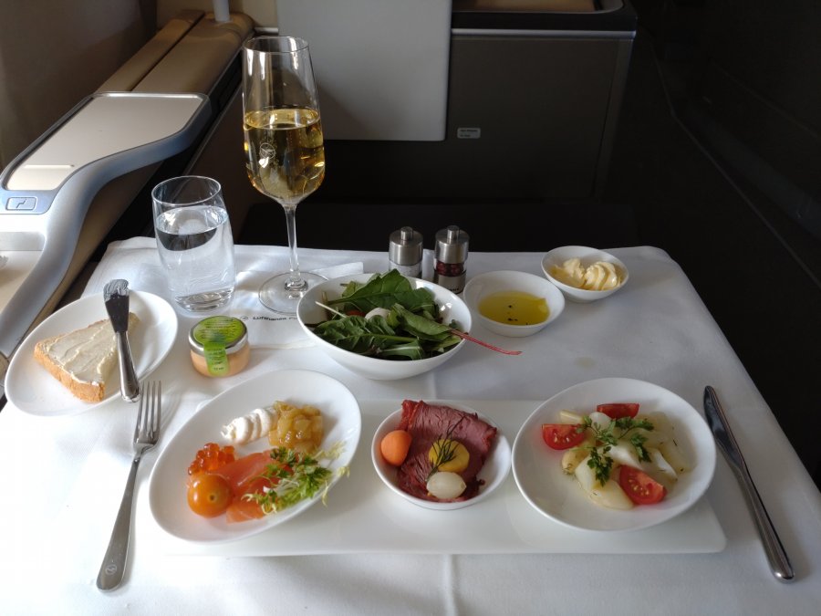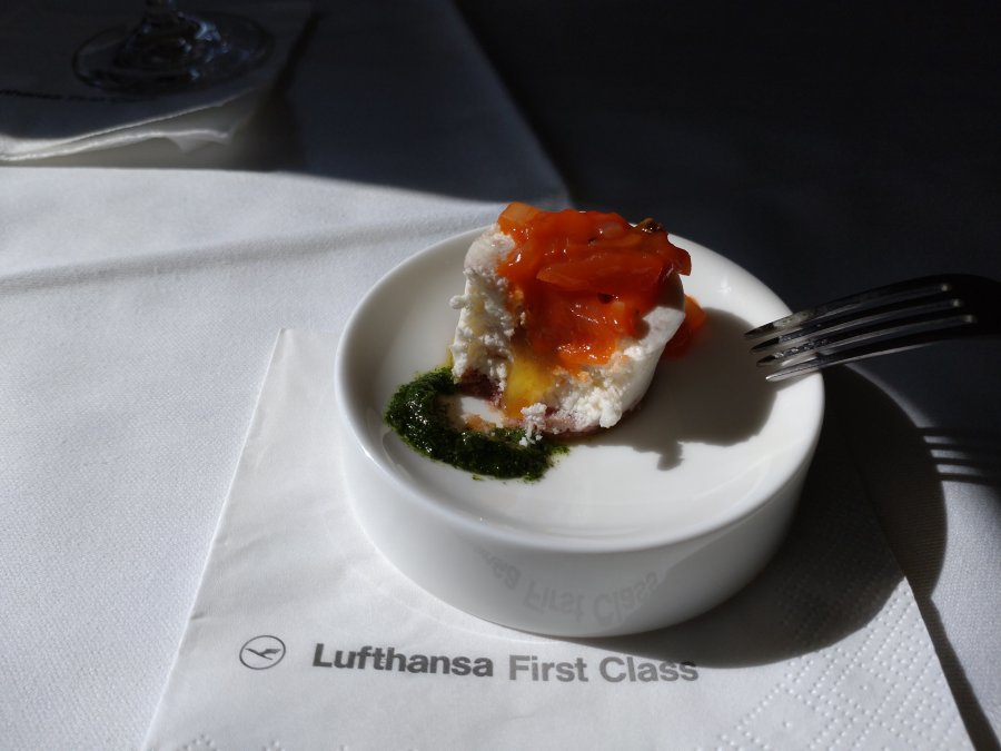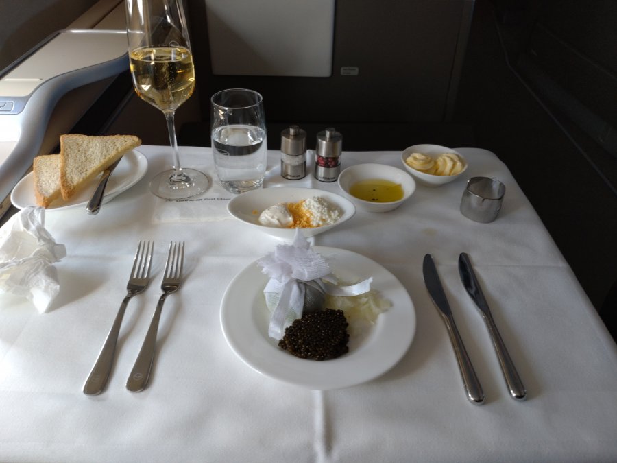 Naturligtvis kaviar. Jag fick en större portion då resenären på 1A ratade denna rätt! Däremot fick jag inte en andra portion då det var slut. Champagnen som inmundigas är 2004 Pommery Cuvée Louise. Lufthansa fyller champagne-glasen till hälften och vatten-glasen till fullt. Inte så dumt, så man inte blir överförfriskad.