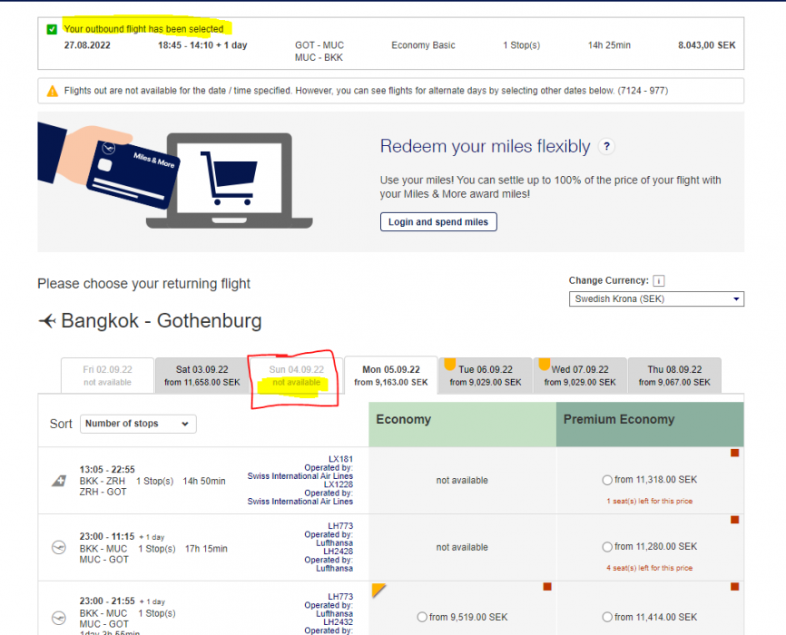 Vid bokning av ToR finns ingen hemresa 4 Sep, BKK-GOT --> Biljetten finns ej 4 Sep