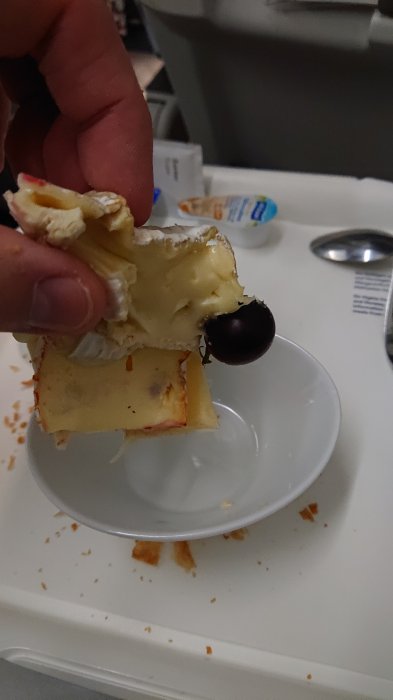 Off topic, men vad är det där? Har vridit på huvudet några gånger för att förstå... Är det en brieost med en oliv på sidan, och en bit lasagne som hänger ner undertill...?Frukostservering som bäst kan beskrivas som "gårdagens klägg"