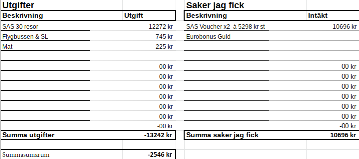 Totalt kostade de 30 flygresorna jag hann göra mig 12.272 kr. Jag hade tänkt att spendera cirka 15.000 kr men tack vare att SAS bestämde sig för att räkna inställda flyg mot kvalificering så sparade jag cirka 4000 kr.