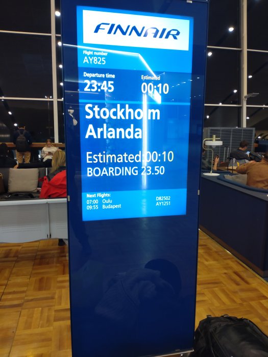 Nästa etapp är AY825 till Stockholm. Ordinarie avgångstid 23:45, men just nu planerad till 00:10. Så länge man håller sig till det borde jag hinna med sista expressen hem, annars blir det klart mycket käbbligare.