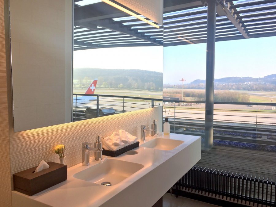 Jag gick direkt efter ankomst till F-loungen i E-terminalen för att fräscha upp mig innan jag valde en god kalvkorv till lunch. Ett lokalt vin av Räuschlingdruva från kantonen Zürich ackompanjerade. Perfekt med tillgång till F-loungen även på ankommande flyg. Och i E-terminalen är den verkligen luftig och skön.