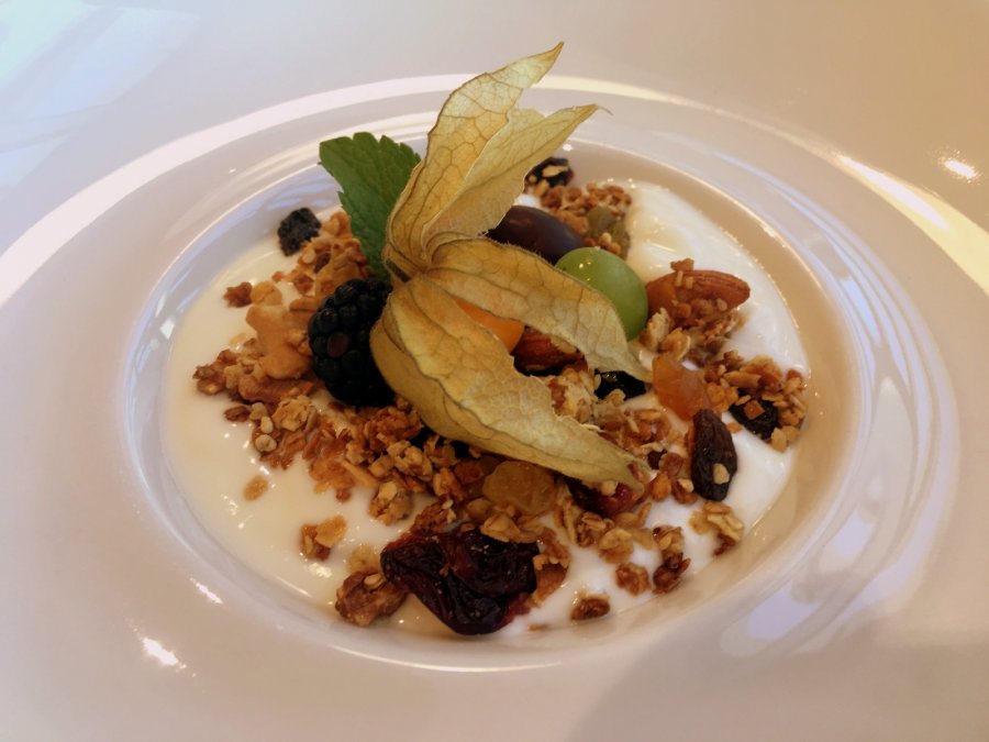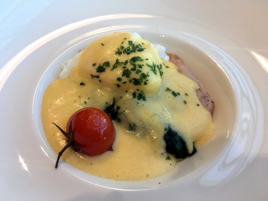 I loungen åts frukost. Hemlagad müsli med yoghurt och frukt följt av ägg à la Benedict. Nypressad apelsinjuice!