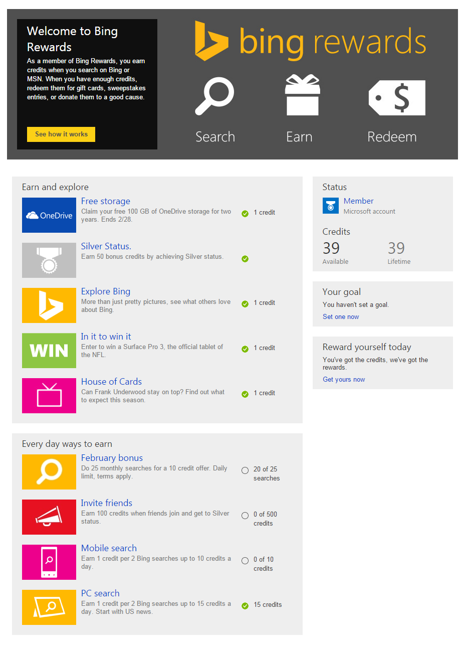 Nytt spännande sätt att boosta sina miles. Microsoft lanserade nyligen Bing Rewards som ger möjlighet att samla credits genom att utforska och använda Microsofts tjänster. Framförallt går det att samla credits genom att söka på Bing. Credits går att växla in emot olika belöningar, bland annat hos ett antal flygbolag inklusive United. För tillfället är Bing Rewards endast tillgängligt i USA så bifogar ett par skärmdumpar.
