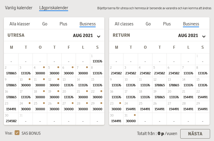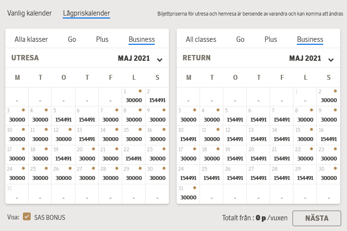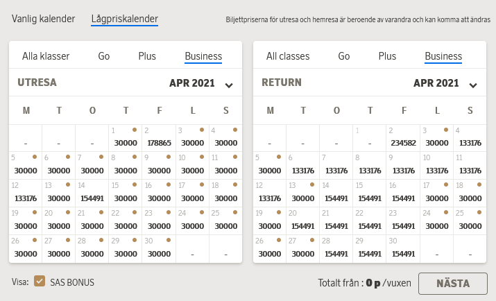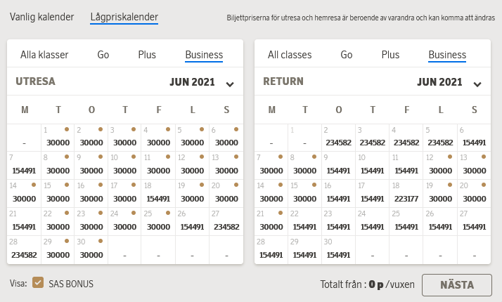 Fly Premium från SAS MC.Bra info! Men är det något jag missar? Ser att du valt Business, men priset är 30000. Hur får du till det?
