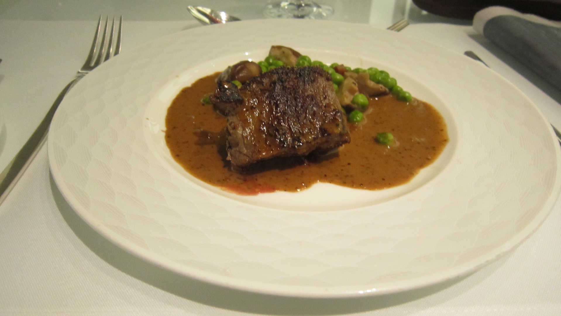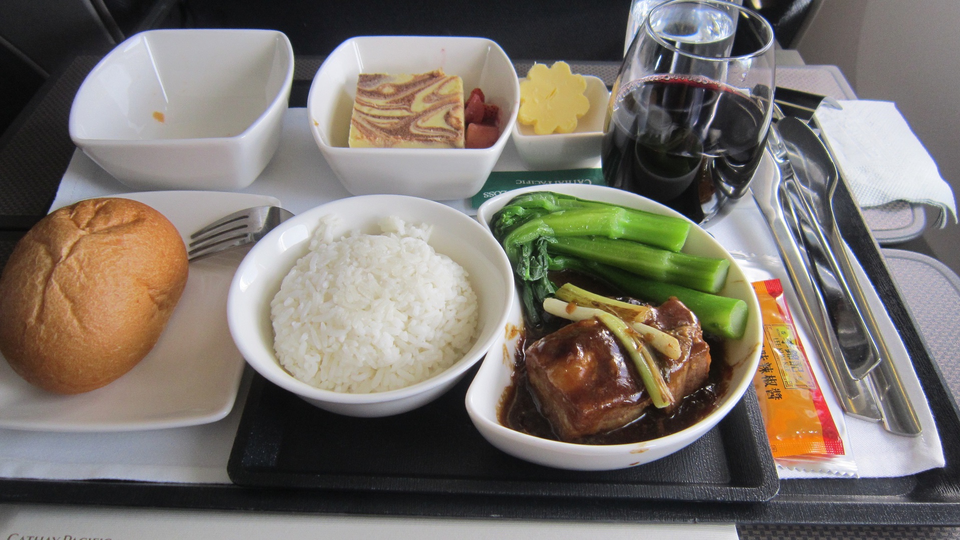 På flygningen serverades det ”gamla” vanliga, färskt frukt som förrätt och två rätter att välja på till huvudrätt. Efter besöket i The Wing var jag ju föga överraskande inte så hungrig, men jag tänkte låta ”Chef Kwong” få en chans, så det fick bli revbensspjäll. Är normalt sett inte något större fan av denna rätt, eftersom jag inte håller en blandning av ben, senor, fett och lite köttstrimlor som någon delikatess. Men i den här rätten var det faktiskt övervägande kött och det hela smakade riktigt bra. Efterrätten hoppade jag dock över av naturliga skäl.