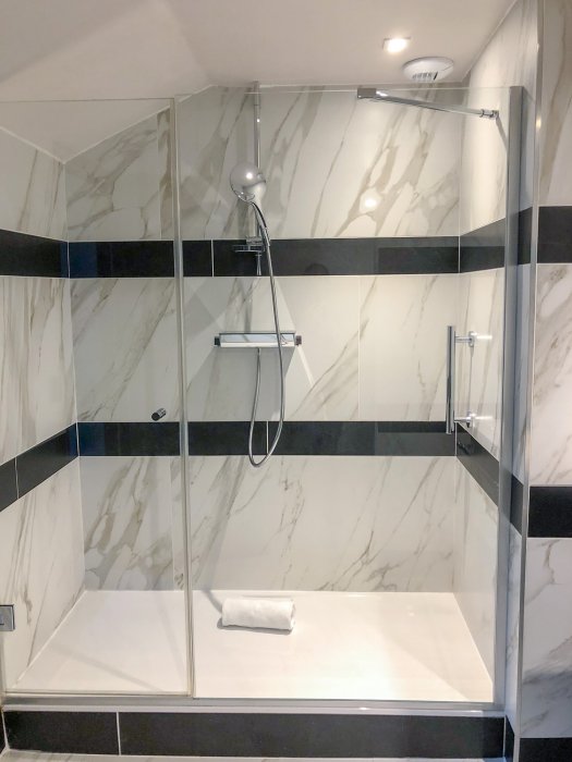 Rejält tilltaget badrum med en stor dusch samt avskild del för toaletten.