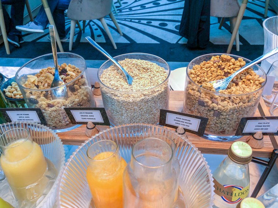 Färskpressad juice, två olika äppelsorter och apelsinjuice. Utöver det fanns det mineralvatten och vatten på flaska samt mjölk. Lite olika frön, müsliblandningar och torkad frukt.