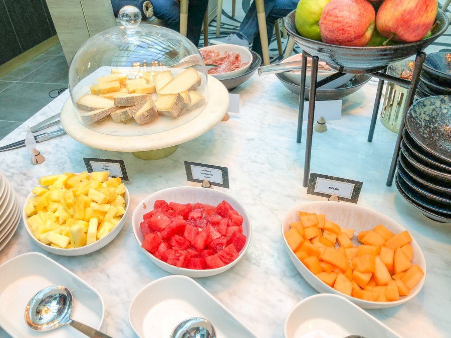 Färsk uppskuren ananas och två olika melonsorter samt äpplen och päron. Det fanns även lite olika charkuterier och ostar.