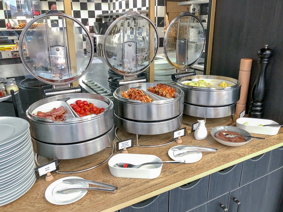 Det varmt som fanns var bacon, ungsbakade tomater, belgiska våfflor och äggröra.
