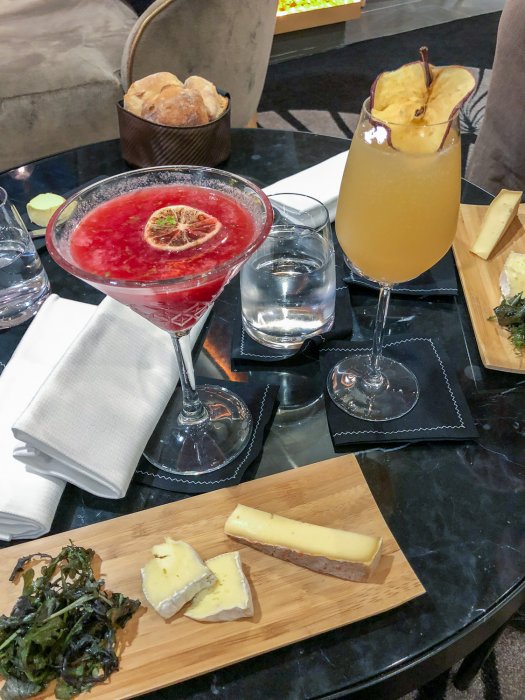 Vi fick även vouchers för varsin drink och en appetizer som vi tog i baren andra kvällen. Det visade sig att drinkarna fick vi välja fritt ifrån listan, men appetizern var en förutbestämd rätt som innehöll skaldjur. Då jag är allergisk mot skaldjur så erbjöd de sig i stället att servera lite ost istället vilket vi tacksamt tog emot. Valet föll på en Cosmobellini och en Serendipiti samt en alkoholfri Mango Sparkler till dottern. En trevlig start på kvällen helt klart.