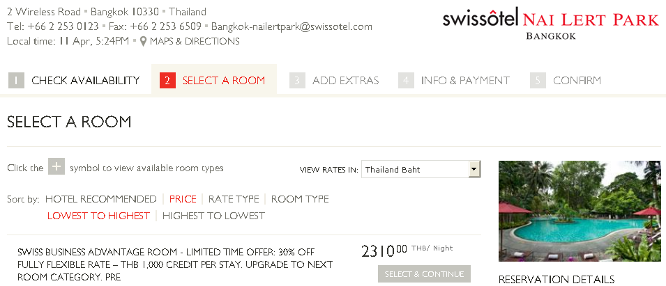Jag fick ett bra erbjudande på deras webbsida där jag kunde boka ett Swiss Business Advantage rum för ca 2.700 THB (ca 550 SEK) per natt utan frukost och garanterad uppgradering till nästa rumkategorin.