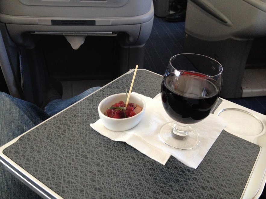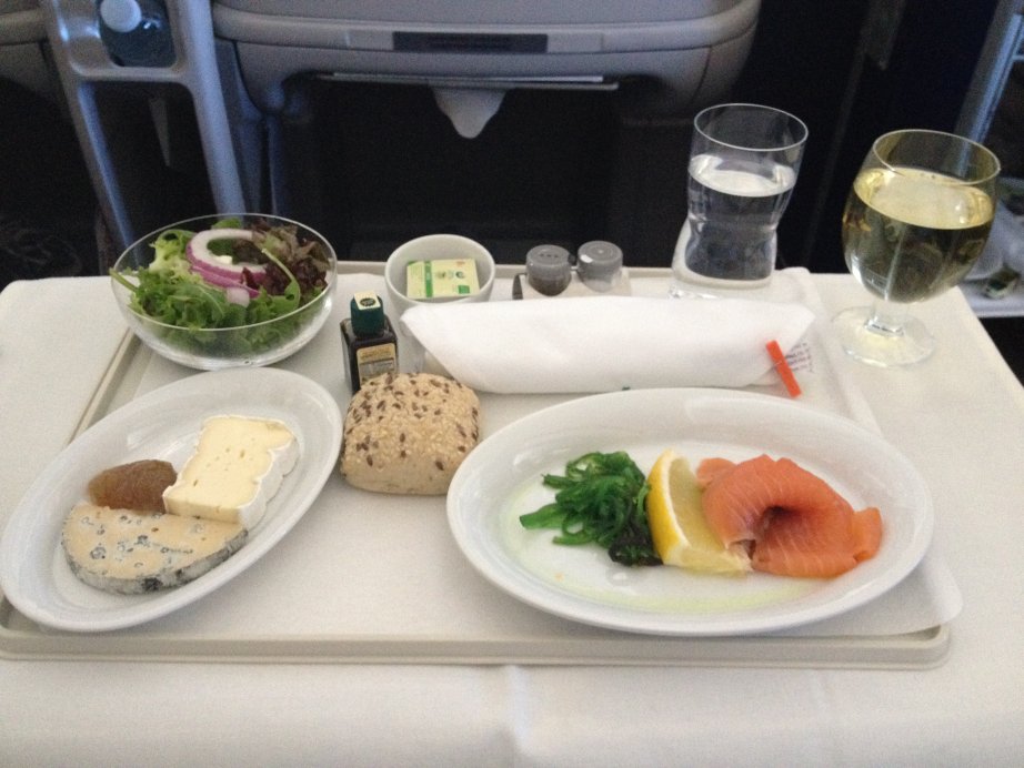 Efter 20 min i luften så kommer påfyllnad av champagne för den som önskar men jag väljer istället ett glas rött av märket Falernia Syrah Reserve 2008. Smakar helt ok tycker jag. Då jag är en förvirrad själ (enligt fru flapps) så glömde/tappade/kastade "välj själv" jag menyerna någonstans så jag låter dom halv dåliga bilderna berätta vad vi åt :cool: