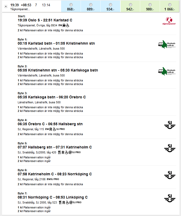 Johan Pfeifer Medlem 26 Mars 2012 #7 Jacob skrev: Var det här en rutt som kom upp på SJs hemsida? Klicka för att utvidga... Japp. Det kom till och med upp två olika varianter med samma start och sluttid, men med några mindre skillnader på mellansegmenten. Jag valde en 6 timmars resa med 1 byte för runt 350:- i stället... Och Charles, om du hör av dig nästa gång du ska åka så kan du höra av dig så ska jag nog kunna boka in dig!