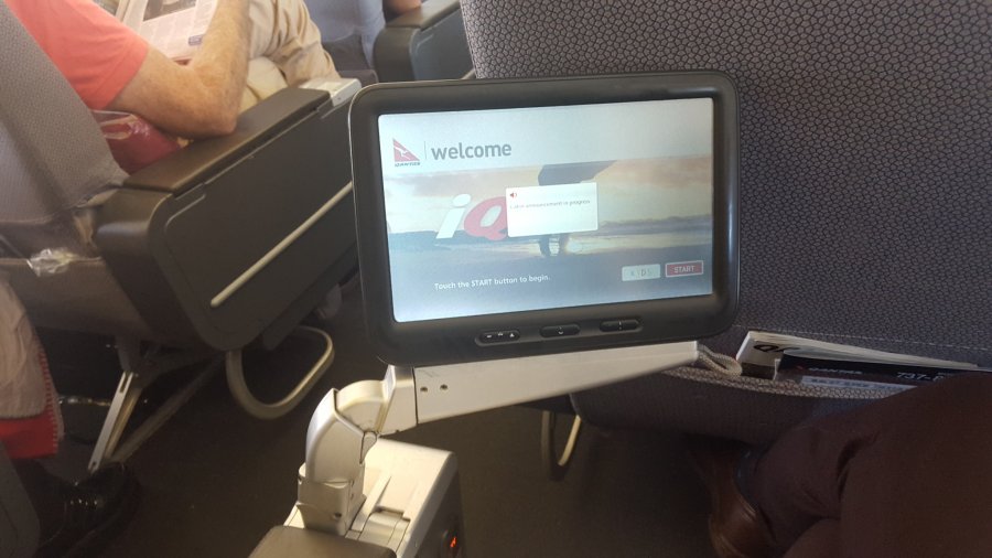 Istället får man fälla upp IFE ur armstödet vilket innebär att man får vänta tills efter take-off innan man kan spana in utbudet. Economy har däremot infällda skärmar. På domestic får man iPads i Economy och i business har man stora, fina skärmar.